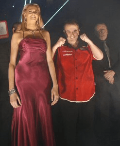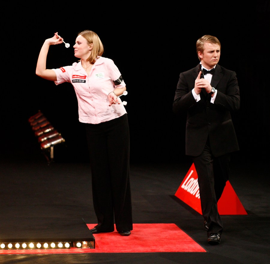 In 2009 top lady darter Anastasia Dobromyslova qualified for the Ladbrokes.com PDC World Darts Championship held at the Alexandra Palace, London. Clearly it would have been inappropriate to have a walk-on girl accompany her to the stage so for balance the PDC provided a ‘walk-on man’. That man was Kristian McDonald, an actor and the son of our MC John! (Image © PDC/Lawrence Lustig. Used with permission.)