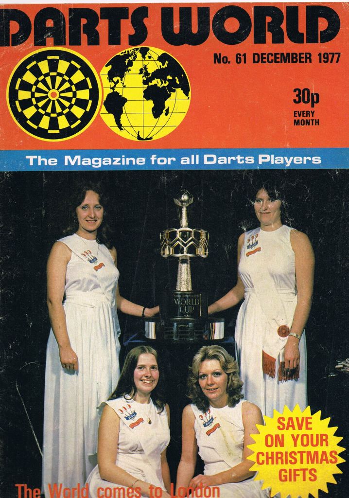 The event was the World Cup and the venue the Wembley Conference Centre, London. As always, at that time, Olly Croft was the top man at the BDO and it was his daughters Elaine and Lesley, dressed in long white dresses and wearing sashes, who led the players on to the stage. The Croft girls were also featured at that year’s WINMAU World Masters. [Insert Darts World front page December 1977]
