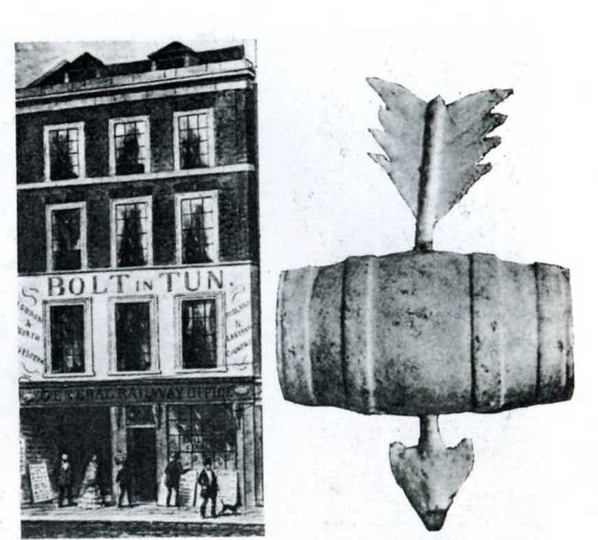 That, as it happens, is just as well as the sign for The Bolt in Tun (formerly of Fleet Street) mentioned in the 1837 coach list shows what appears to be a crossbow bolt through a beer barrel. I discovered this in Paul Corballis’s book Pub Signs (1988). A print dated 1859 shows ‘the combined use of the traditional signs together with contemporary sign-writing.’ Focussing more on the design of signs rather than origins of pub names Corballis makes no further comment about the nomenclature.