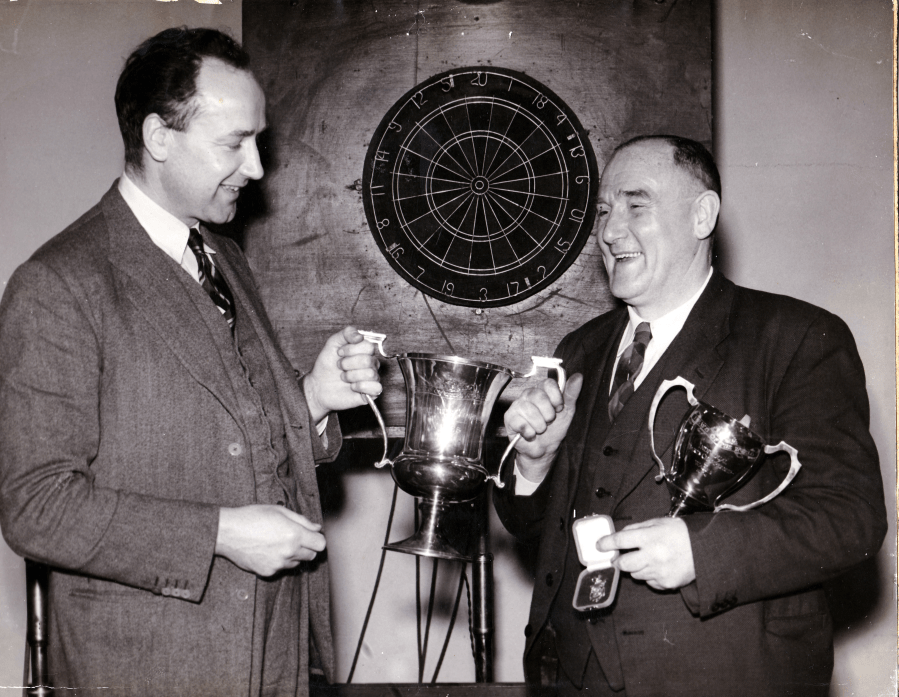 At the start of the 1953/54 season, armed with his ‘bombers’, heavy-weighted brass darts he had always used, darts he had specially filed down for better grip, Oliver won through the News of the World preliminary rounds. From there he travelled to Cardiff where he won the Wales divisional title, being presented with a magnificent trophy by former international and Captain of the Glamorgan County Cricket Club, Wilfred Wooller. (See image. Oliver James is on the right.)
