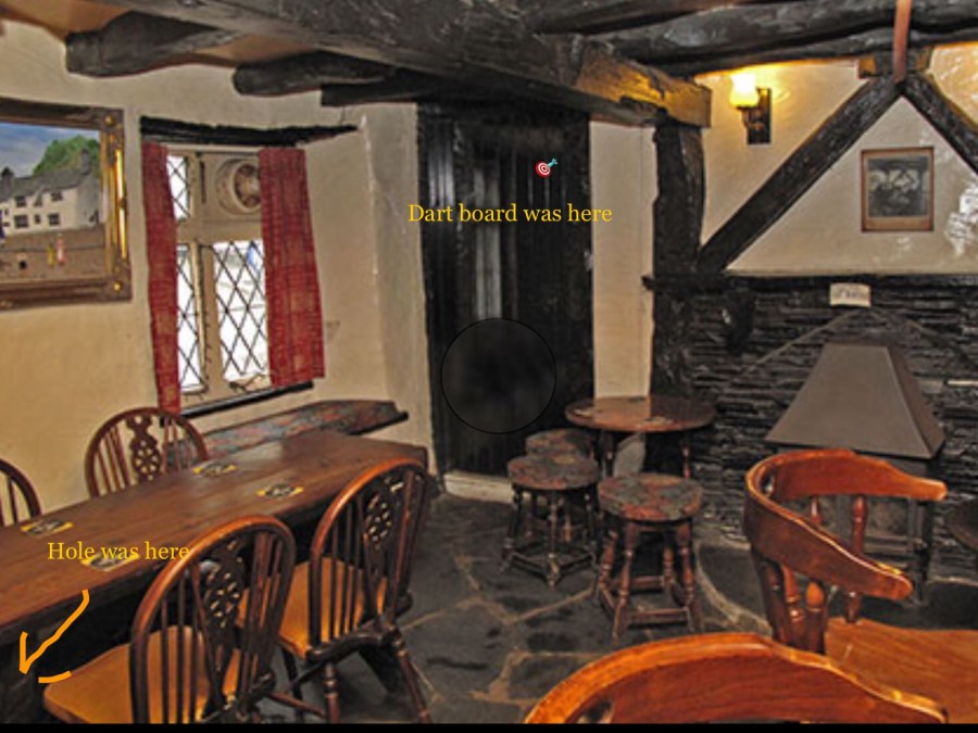 The floor did have a hole in it that did have a cover. I haven’t been to the pub for years and as far as I know the hole is still there.