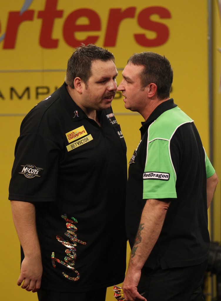 Then there is the simple disruption of a game by an opponent or both players which results in an argument, for example back in 2012 when England’s Adrian Lewis and Wales’ Ritchie Burnett were involved in an altercation which was eventually smoothed out by referee Russ Bray. (Image below © Tip Top Pics. Used with permission.)
