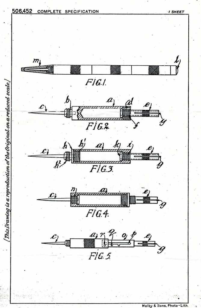 The Northwood Collapsible Dart was invented by Robert Bowles in the mid-1930s and he patented the idea in 1938. The shaft of each dart was contained within the hollow body of each arrow and had to be screwed out and tightened before flights could be inserted. The patent specification (extract shown here) shows a number of alternative methods of construction. FIG 5 is merely an extension of Bowles’ idea which allows for a longer dart by way of a telescopic shaft.