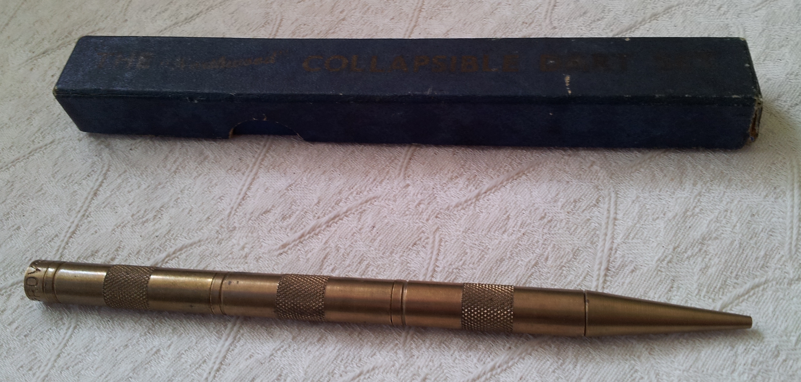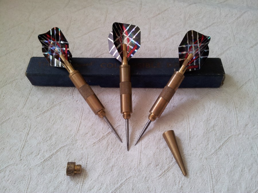 Constructed almost entirely of brass (the metal of choice until tungsten arrived) the three darts could be assembled into a single unit so as to be transported in a coat pocket without apparently causing damage to clothing.