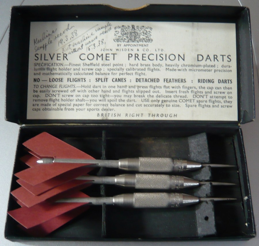 Lowy’s darts were marketed through John Wisden & Co who, at the time, held the Royal Warrant for the supply of sports goods. Wisden’s had for many years sold a range of sports goods under their own brand including tennis racquets, which were manufactured by others. The brand name was ‘Silver Comet’ and Lowy’s darts were included in that range. Wisden’s sold Lowy’s darts in boxes of three which in itself was an innovation at the time as until then, unless three darts had been provided with a dartboard as part of a set, darts were sold singularly; working class players not being able to afford or indeed need to replace all three darts at one time.