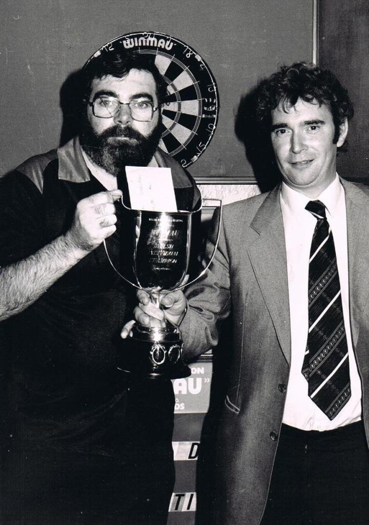 Ceri won the WINMAU Welsh Open in 1980. The venue was the Diamond Theatre Club, Caerphilly. Ceri defeated John Corfe (Clwyd) in the semi-finals and then beat Wales’ Wayne Lock in straight sets (2-0, 2-0) in the final. (The image shows Ceri being presented with the Welsh Open trophy by Harry Kicks jnr of the WINMAU Dartboard Company.)