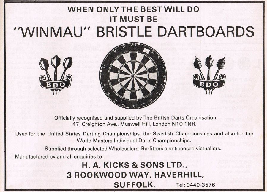 H. A. Kick & Sons was founded in 1946 by ex-Sergeant Major Harry Kicks, who, in 1976 renamed the company WINMAU after his wife Winifred Maud – with the name pronounced as “win-more”. (See company advertisement (below) from Darts World, April 1976, that indicates the name change.)