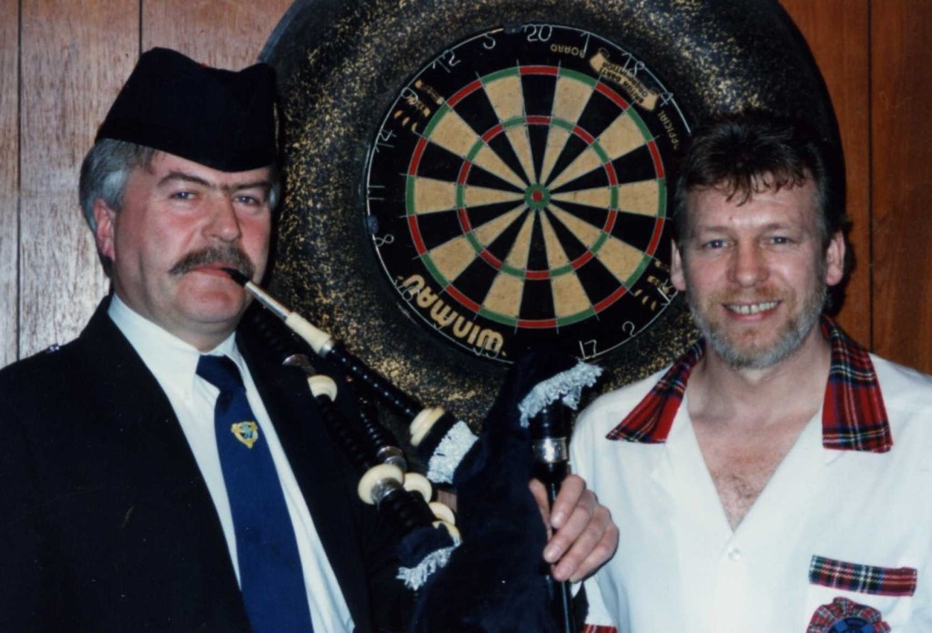 As in the previous year Jamie was piped on to the Lakeside stage by piper Angus Ingram (Image, below. The PC Archive) for the 1993 Embassy World Championship for the first-round match against the on-form, Mike Gregory. Jamie was beaten 3-0 by Mike (Mike’s average 31.59; Jamie’s 28.97.) Jamie did not say afterwards if his earlier conversation with the official affected his performance. I doubt it.